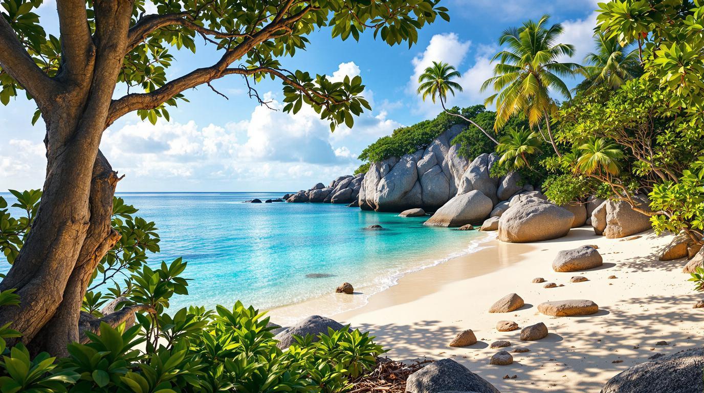 Ces arbres côtiers centenaires forment une canopée naturelle unique aux Seychelles. Leurs racines stabilisent le sable coral, créant des zones d’ombre permanente même à midi. L’écosystème protégé abrite des crabes fantômes et diverses espèces d’oiseaux tropicaux. Cette végétation endémique offre un micro-climat plus frais de 3 à 4 degrés comparé aux plages exposées.